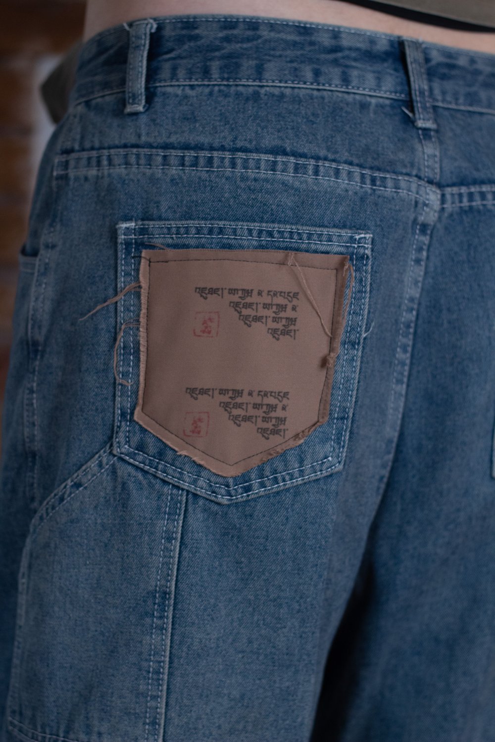 Light blue washed cargo jeans in a relaxed fit, featuring a false embroidered printed pocket that gets better with wear. Each printed pocket is unique; sewn to enable fraying over time giving our cargo jean it's organic name.