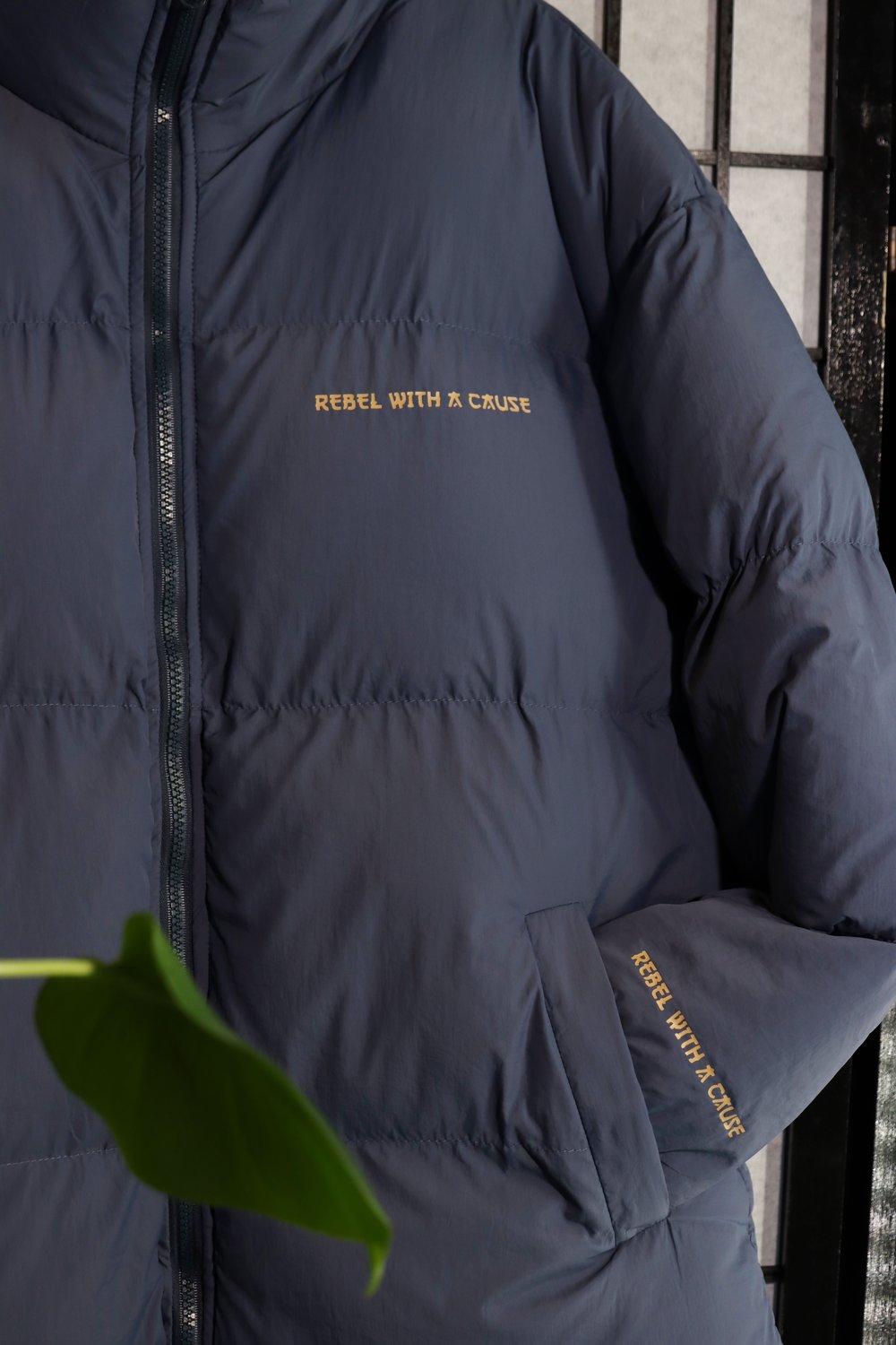 Puffer Coat / Jacket with zip fastening, Rebel With A Cause print on chest and sleeve cuff.